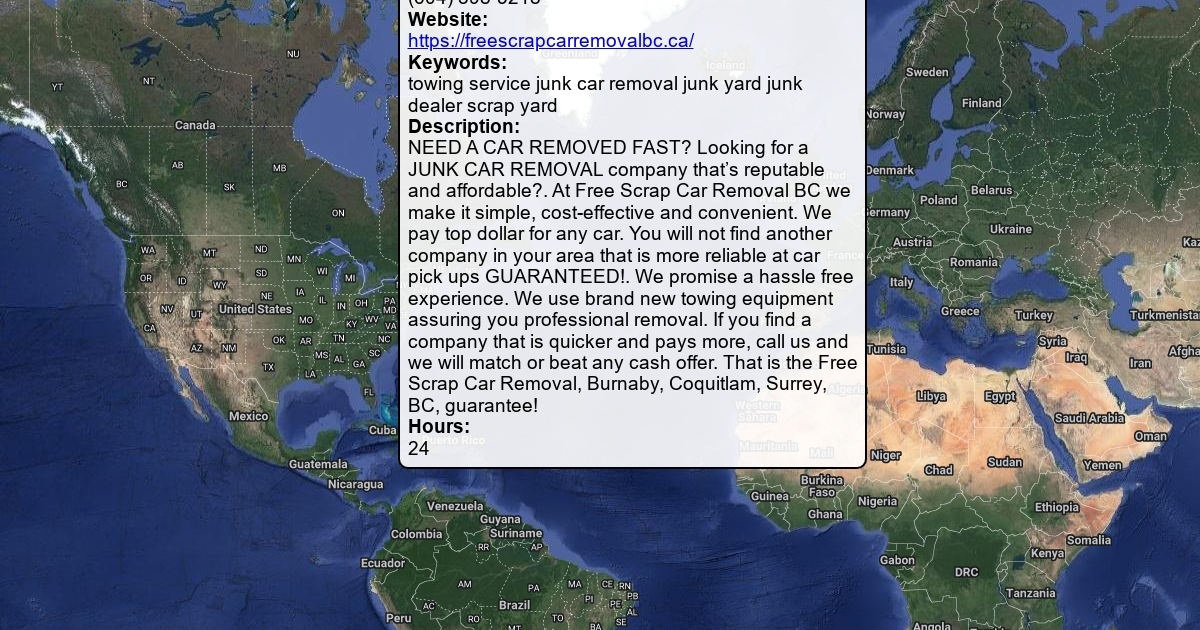 Address: 107 - 7655 Edmonds St Suite # 551, Burnaby, BC V3N 0C3 Phone: (604) 398-5218 Website: https://freescrapcarremovalbc.ca/ Keywords: towing service junk car removal junk yard junk dealer scrap yard Description: NEED A CAR REMOVED FAST? Looking for a JUNK CAR REMOVAL company that’s reputable and affordable?. At Free Scrap Car Removal BC we make it simple, cost-effective and convenient. We pay top dollar for any car. You will not find another company in your area that is more reliable at car pick ups GUARANTEED!. We promise a hassle free experience. We use brand new towing equipment assuring you professional removal. If you find a company that is quicker and pays more, call us and we will match or beat any cash offer. That is the Free Scrap Car Removal, Burnaby, Coquitlam, Surrey, BC, guarantee! Hours: 24