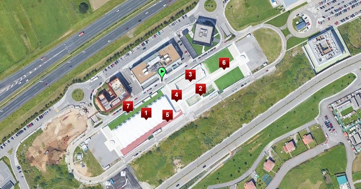 MAPA CON EL INICIO DE LA GYMKANA MARCADO EN VERDE Y EL LUGAR DE LAS POSTAS EN ROJO.