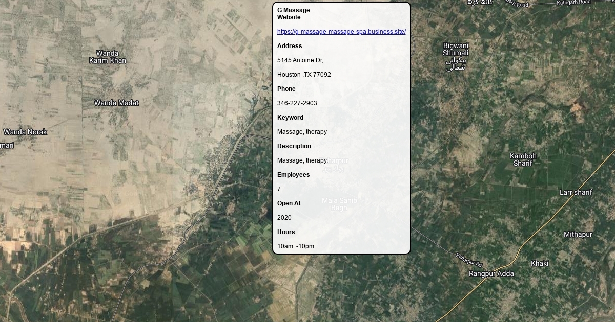Website https://g-massage-massage-spa.business.site/ Address 5145 Antoine Dr, Houston ,TX 77092 Phone 346-227-2903 Keyword Massage, therapy Description Massage, therapy. Employees 7 Open At 2020 Hours 10am -10pm