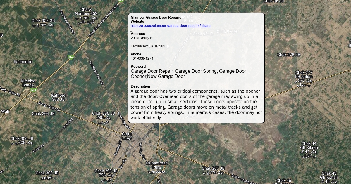 Website https://g.page/glamour-garage-door-repairs?share Address 29 Duxbury St Providence, RI 02909 Phone 401-608-1271 Keyword Garage Door Repair, Garage Door Spring, Garage Door Opener,New Garage Door Description A garage door has two critical components, such as the opener and the door. Overhead doors of the garage may swing up in a piece or roll up in small sections. These doors operate on the tension of spring. Garage doors move on metal tracks and get power from heavy springs. In numerous cases, the door may not work efficiently.