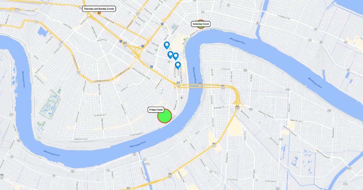 Map of hotels with room blocks and the approximate locations of events.