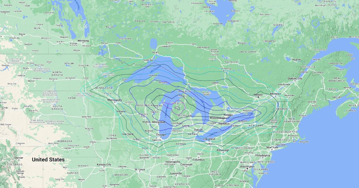 Snowfall map of a hypothetical snowstorm impacting the Great Lakes region