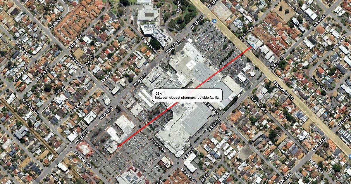 Straight line to nearest pharmacy outside facility