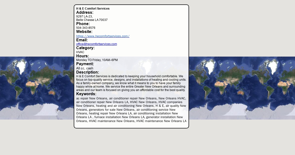 Address: 9297 LA-23, Belle Chasse LA 70037 Phone: 504-343-8576 Website: https://www.hecomfortservices.com/ Email: [email protected] Category: HVAC
