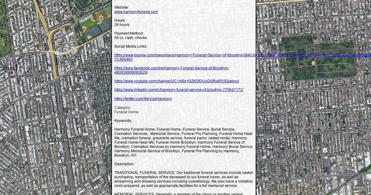 Address: 2200 Clarendon Road, suite 202 Brooklyn, NY 11226 Phone: (347) 4349729 Website: www.harmonyfuneral.com Hours: 24 hours Payment Method: All cc, cash, checks