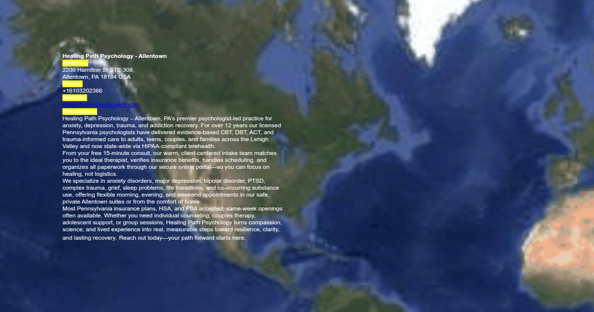 Healing Path Psychology – Allentown, PA’s premier psychologist-led practice for anxiety, depression, trauma, and addiction recovery. For over 12 years our licensed Pennsylvania psychologists have delivered evidence-based CBT, DBT, ACT, and trauma-informed care to adults, teens, couples, and families across the Lehigh Valley and now state-wide via HIPAA-compliant telehealth.
