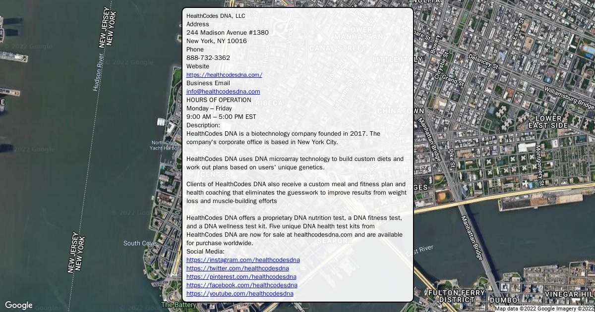 HealthCodes DNA is a biotechnology company founded in 2017. The company's corporate office is based in New York City. HealthCodes DNA uses DNA microarray technology to build custom diets and work out plans based on users' unique genetics. Clients of HealthCodes DNA also receive a custom meal and fitness plan and health coaching that eliminates the guesswork to improve results from weight loss and muscle-building efforts HealthCodes DNA offers a proprietary DNA nutrition test, a DNA fitness test, and a DNA wellness test kit. Five unique DNA health test kits from HealthCodes DNA are now for sale at healthcodesdna.com and are available for purchase worldwide.