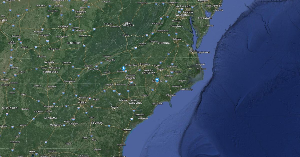 A map of Hickory and Fayetteville in NC, USA