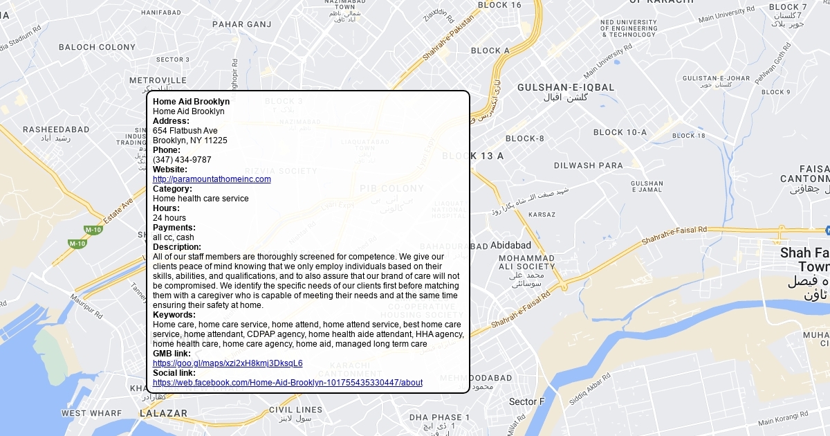 Address: 654 Flatbush Ave Brooklyn, NY 11225 Phone: (347) 434-9787 Website: http://paramountathomeinc.com Category: Home health care service