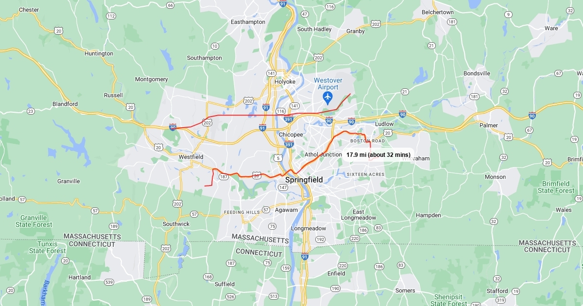 A bird's eye view of distance between my home in Westfield and work in Springfield, MA