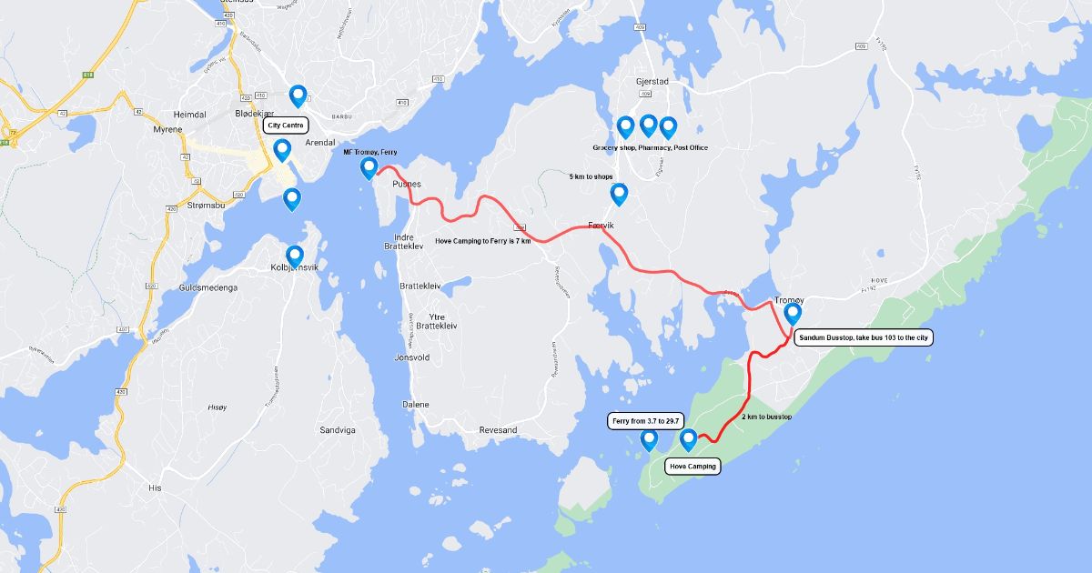 Map ofArendal - Tromøy area and sites realted to Hove Campsite