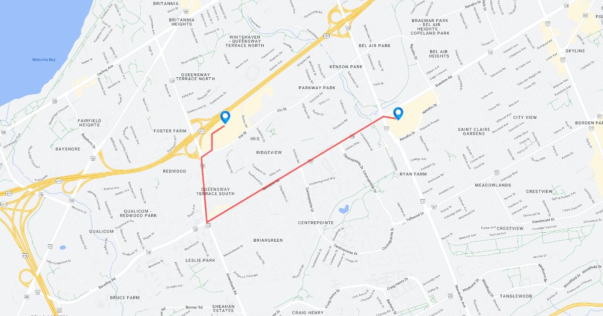 A quick easy map showing which roads to take to get to ikea from College square at Algonquin.