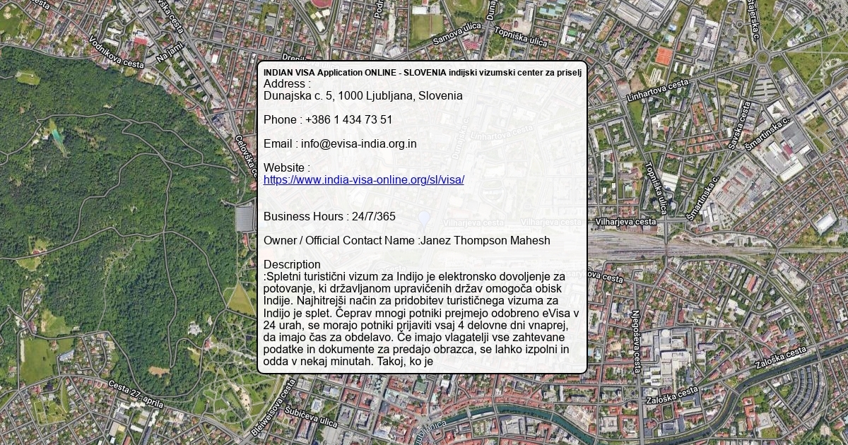 Address : Dunajska c. 5, 1000 Ljubljana, Slovenia Phone : +386 1 434 73 51 Email : [email protected] Website : https://www.india-visa-online.org/sl/visa/ Business Hours : 24/7/365 Owner / Official Contact Name :Janez Thompson Mahesh Description :Spletni turistični vizum za Indijo je elektronsko dovoljenje za potovanje, ki državljanom