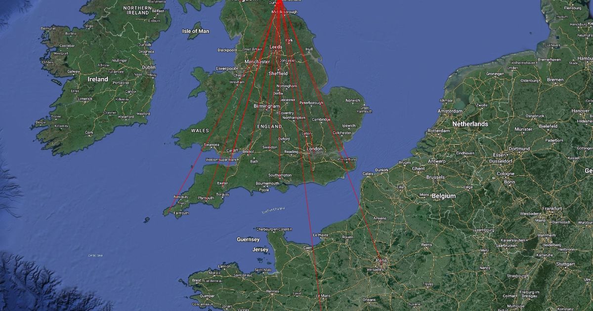 Red lines from South Shields to various destination across the UK and France