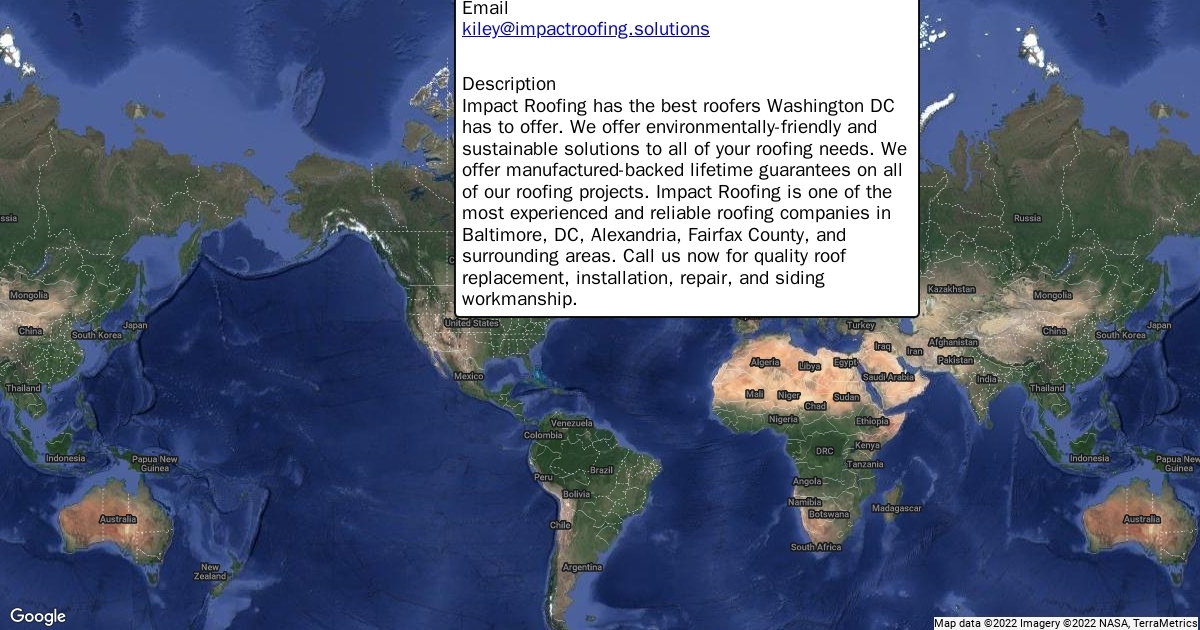 Address 5940 Craft Road Alexandria, VA 22310 Phone (571) 775-3998 Website https://impactroofing.solutions/ Email [email protected] Description Impact Roofing has the best roofers Washington DC has to offer. We offer environmentally-friendly and sustainable solutions to all of your roofing needs. We offer manufactured-backed lifetime guarantees on all of our roofing projects. Impact Roofing is one of the most experienced and reliable roofing companies in Baltimore, DC, Alexandria, Fairfax County, and surrounding areas. Call us now for quality roof replacement, installation, repair, and siding workmanship.