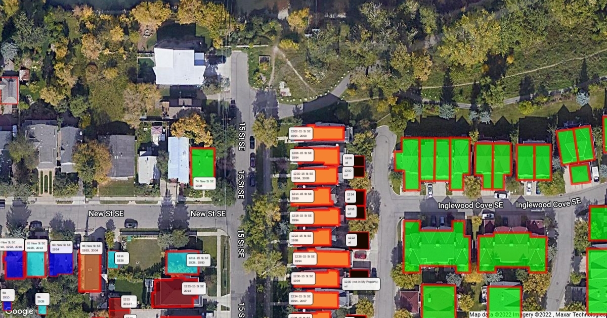 This map indicates the construction dates of the current buildings in Inglewood, Calgary from 1900-1909.