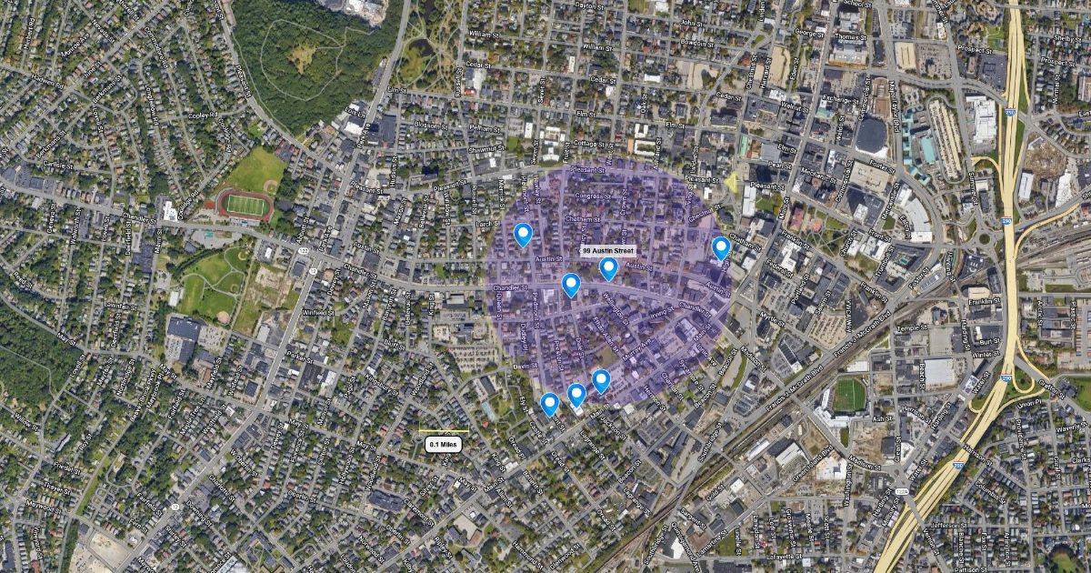 This map depicts various organizations around 99 Austin Street.