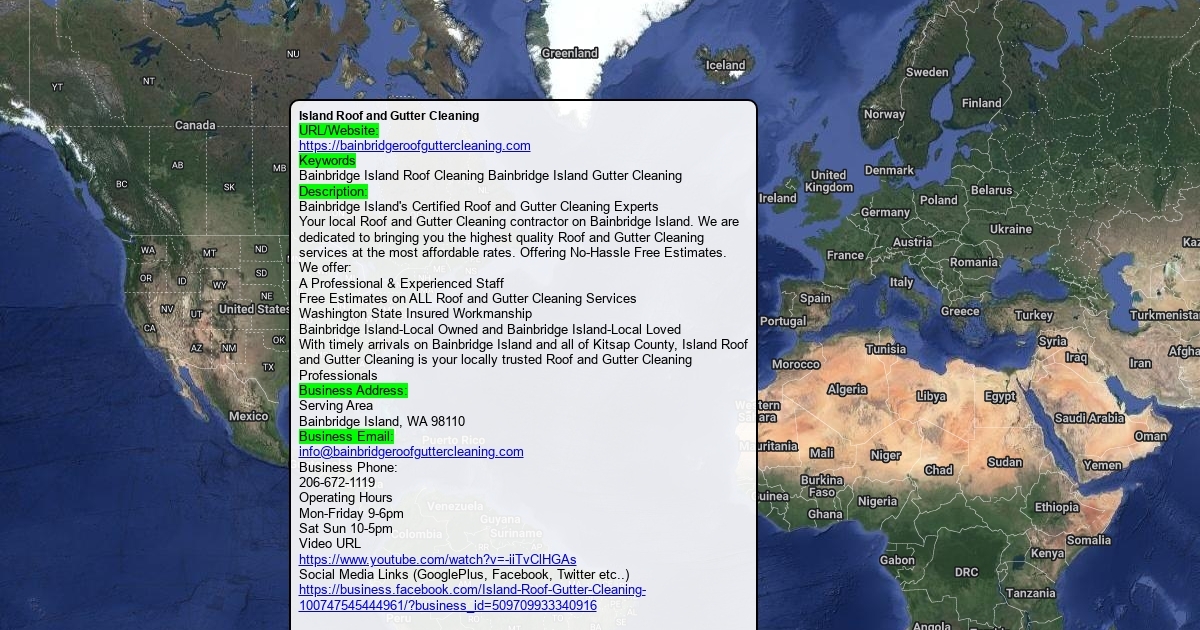 URL/Website: https://bainbridgeroofguttercleaning.com Keywords Bainbridge Island Roof Cleaning Bainbridge Island Gutter Cleaning Description: Bainbridge Island's Certified Roof and Gutter Cleaning Experts Your local Roof and Gutter Cleaning contractor on Bainbridge Island. We are dedicated to bringing you the highest quality Roof and Gutter Cleaning services at the most affordable rates. Offering No-Hassle Free Estimates. We offer: Business Address: Serving Area Bainbridge Island, WA 98110 Business Email: [email protected] Business Phone: 206-672-1119 Operating Hours Mon-Friday 9-6pm Sat Sun 10-5pm Video URL https://www.youtube.com/watch?v=-iiTvClHGAs Social Media Links (GooglePlus, Facebook, Twitter etc..) https://business.facebook.com/Island-Roof-Gutter-Cleaning-100747545444961/?business_id=509709933340916