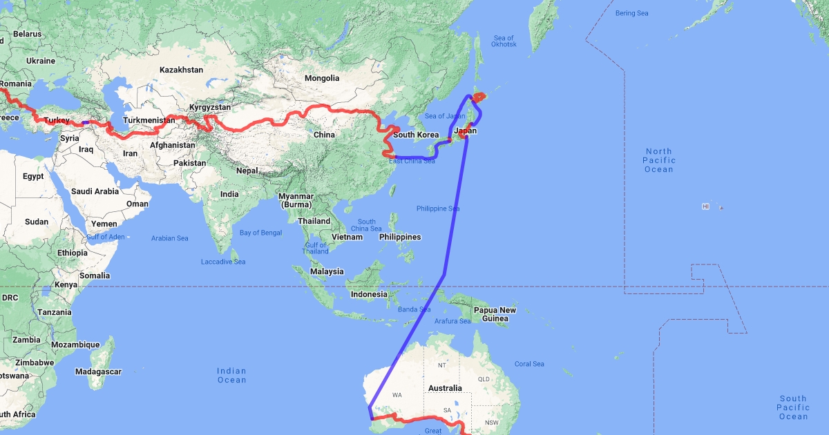 Map showing the route taken so far on my world bike ride