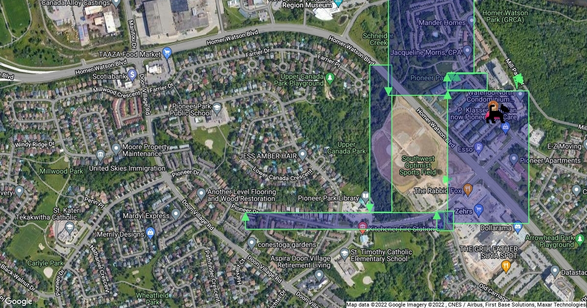 Walked down Pioneer Drive turned left onto trail that goes under Homer Watson to Trail Grand River Conseravation made a left and walked down Mill Park Dr to Green Valley Drive to Pioneer Dr. met a lady and her dog by my Optomistrist on Green Valley Drive