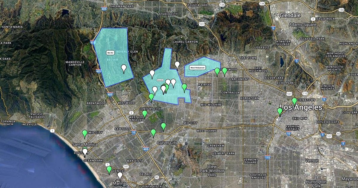 Map of LA's most expensive restaurants and 5* hotels.