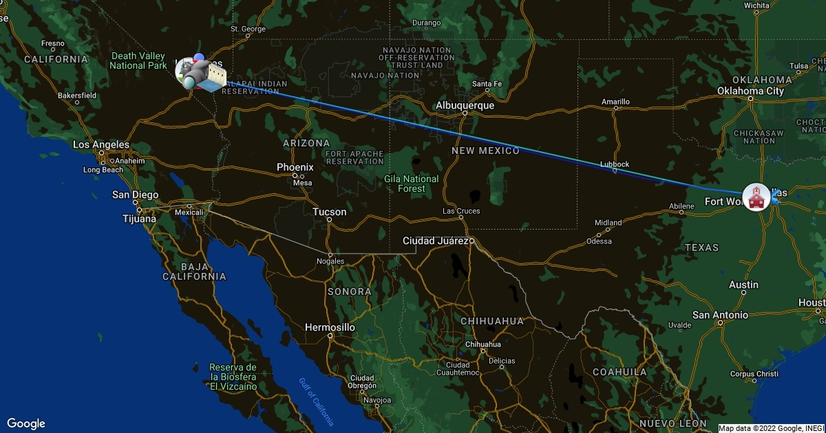 This map includes travel spot of a HS color guard competition trip to Las Vegas, NV in 2016. The lighter colors represent departures as the darker colors represent arrivals. (ie. yellow/orange sky blue/ blue pink/red