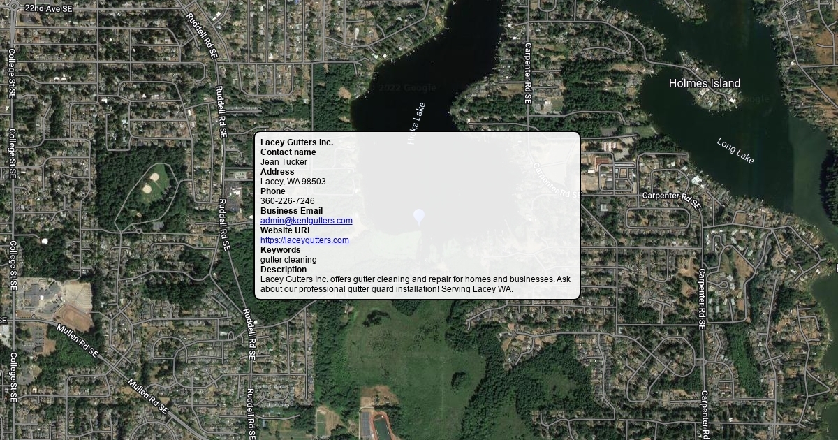 Contact name Jean Tucker Address Lacey, WA 98503 Phone 360-226-7246 Business Email [email protected] Website URL https://laceygutters.com Keywords gutter cleaning Description Lacey Gutters Inc. offers gutter cleaning and repair for homes and businesses. Ask about our professional gutter guard installation! Serving Lacey WA.