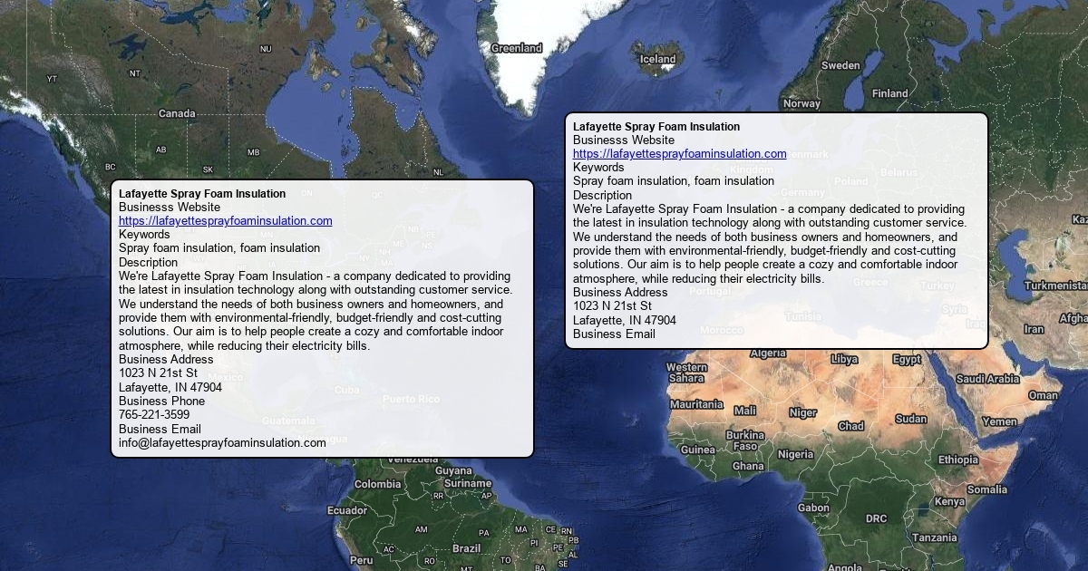 Businesss Website https://lafayettesprayfoaminsulation.com Keywords Spray foam insulation, foam insulation Description We're Lafayette Spray Foam Insulation - a company dedicated to providing the latest in insulation technology along with outstanding customer service. We understand the needs of both business owners and homeowners, and provide them with environmental-friendly, budget-friendly and cost-cutting solutions. Our aim is to help people create a cozy and comfortable indoor atmosphere, while reducing their electricity bills. Business Address 1023 N 21st St Lafayette, IN 47904 Business Phone 765-221-3599 Business Email [email protected]