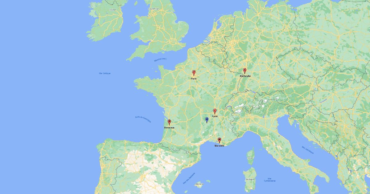 Position of Le Puy-en-Velay amongst other other important cities in France