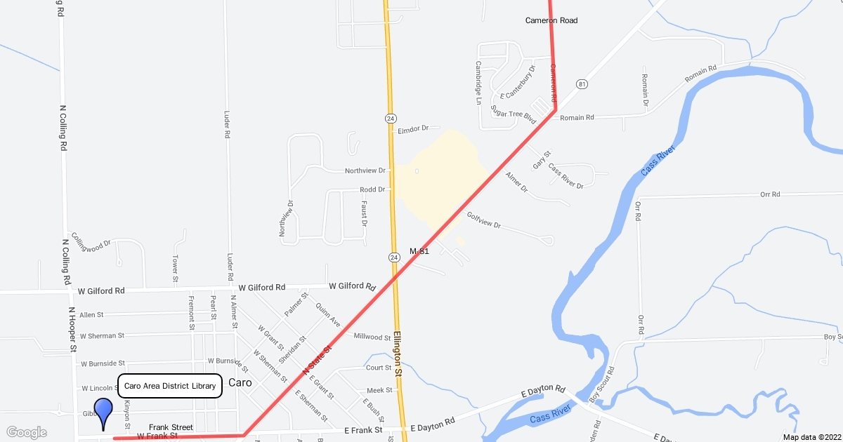 Map from Caro Area District Library to Darbee Park