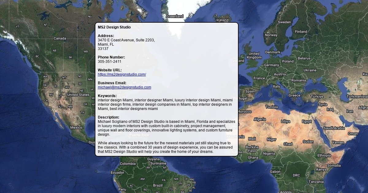 Address: 3470 E Coast Avenue, Suite 2203, Miami, FL 33137 Phone Number: 305-351-2411 Website URL: https://ms2designstudio.com/ Business Email: [email protected] Keywords: interior design Miami, interior designer Miami, luxury interior design Miami, miami interior design firms, interior design companies in Miami, top interior designers in Miami, best interior designers miami Description: Michael Scigliano of MS2 Design Studio is based in Miami, Florida and specializes in luxury modern interiors with custom built-in cabinetry, project management, unique wall and floor coverings, innovative lighting systems, and custom furniture design. While always looking to the future for the newest materials yet still staying true to the classics. With a combined 30 years of design experience, you can be assured that MS2 Design Studio will help you create the home of your dreams.