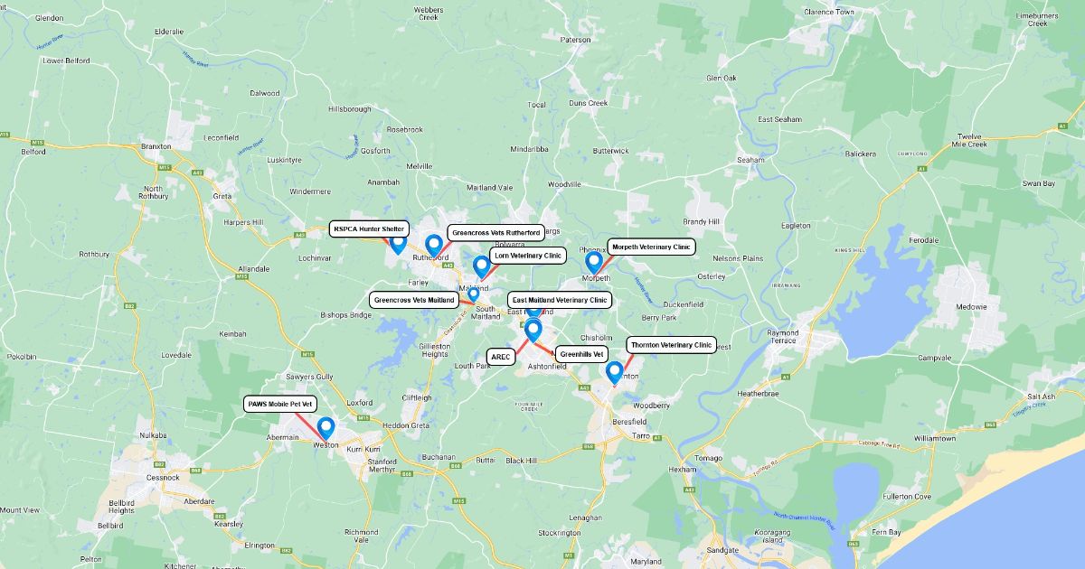 Locations of vet proactices and hospitals in the maitland lga