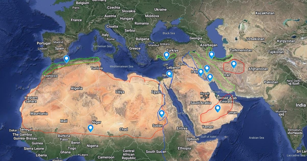 The Map of Middle East deserts, mountains, rivers