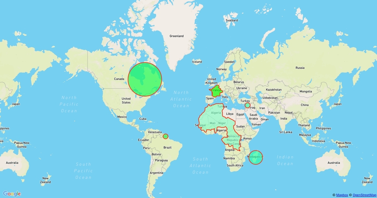 Map representing the countries where the French language is spoken