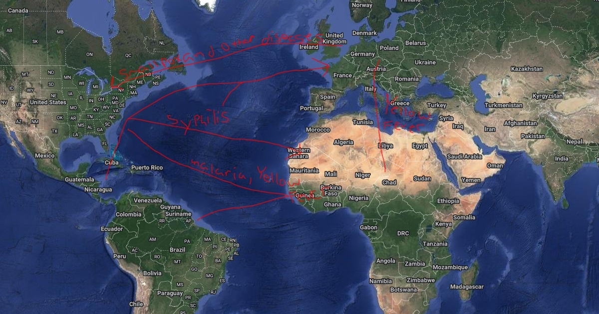 This is a map of the spread diseases during the columbian exchange