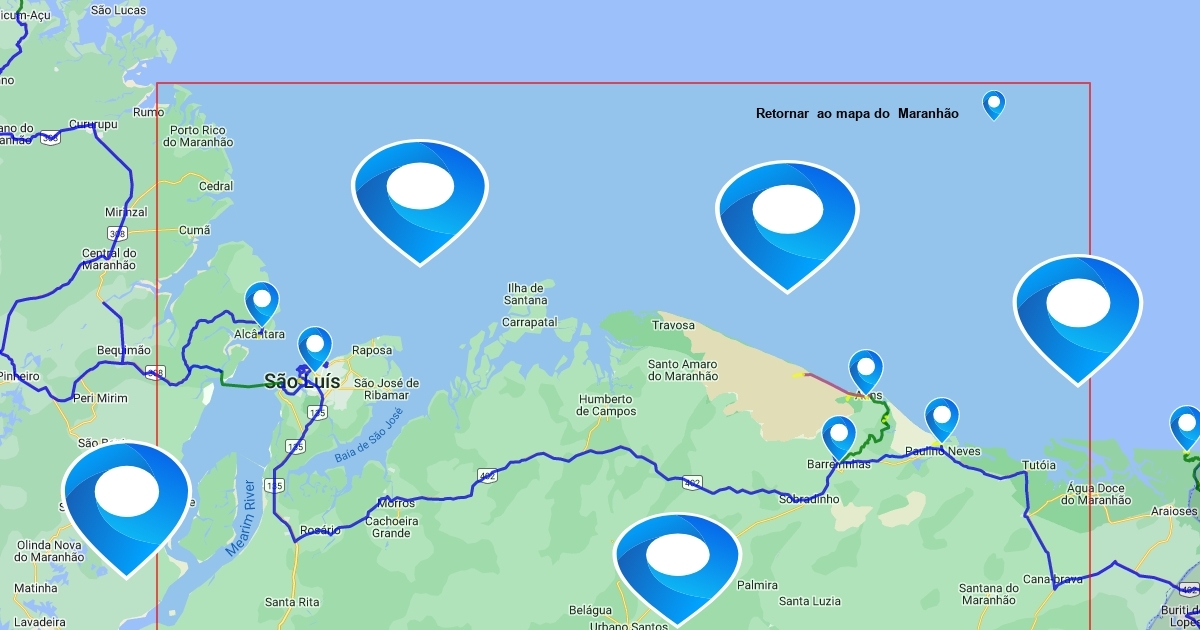 Roteiro da Expedição 1000dias - litoral do Maranhão. Use os ícones para acessar as atrações que visitamos na região ou então os controles de zoom para ver nosso roteiro com mais detalhes