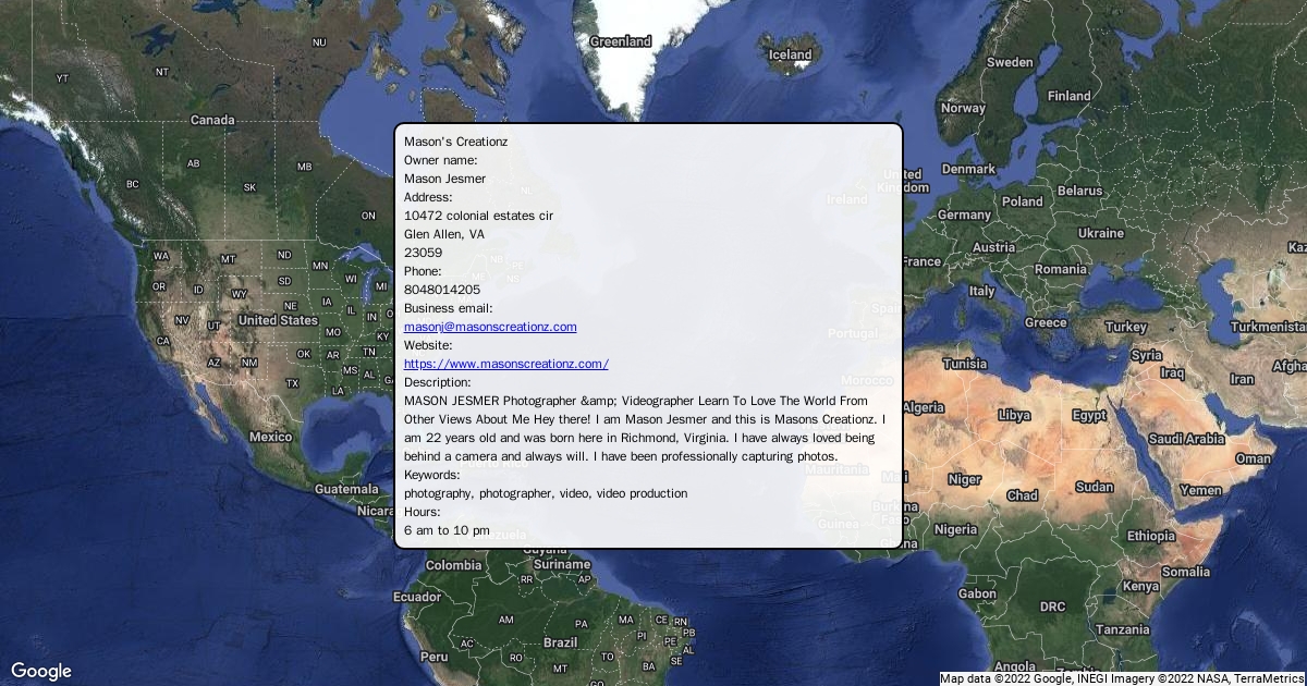 MASON JESMER Photographer & Videographer Learn To Love The World From Other Views About Me Hey there! I am Mason Jesmer and this is Masons Creationz. I am 22 years old and was born here in Richmond, Virginia. I have always loved being behind a camera and always will. I have been professionally capturing photos.