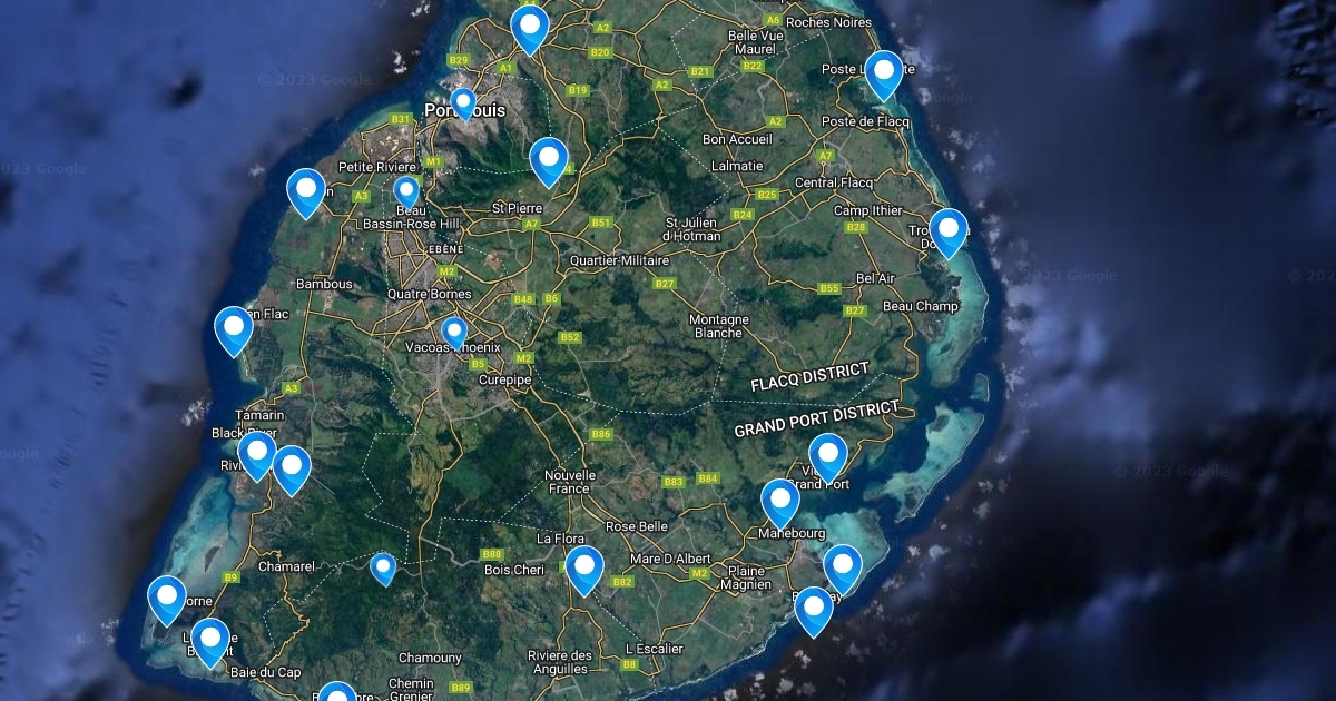 A map of Mauritius with mountains, rivers and beaches