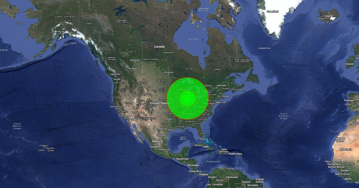 Smallest circle is 10 mi, then 100, 200, last is 500 miles.