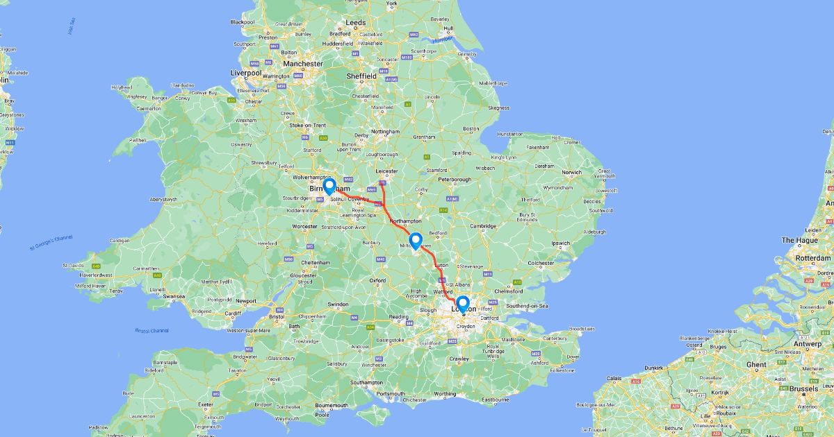 Shows connectivity between Milton Keynes, Birmingham and London