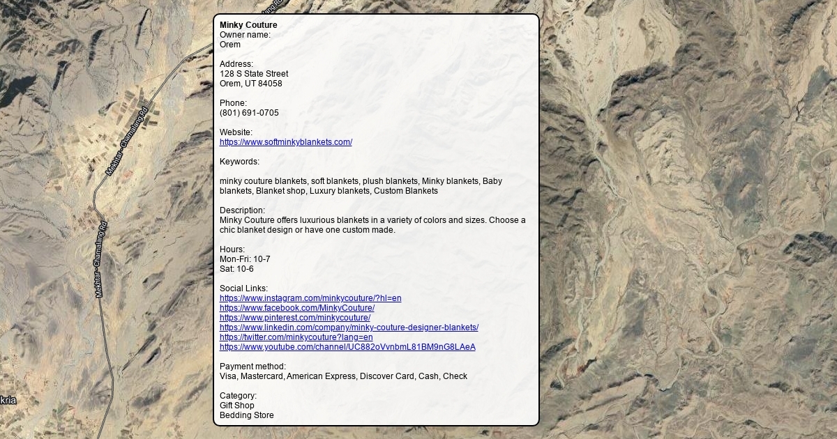 Address: 128 S State Street Orem, UT 84058 Description: Minky Couture offers luxurious blankets in a variety of colors and sizes. Choose a chic blanket design or have one custom made.