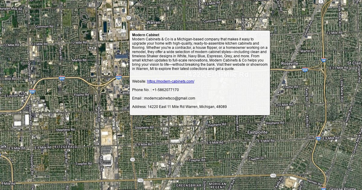 Modern Cabinets & Co is a Michigan-based company that makes it easy to upgrade your home with high-quality, ready-to-assemble kitchen cabinets and flooring. Whether you're a contractor, a house flipper, or a homeowner working on a remodel, they offer a wide selection of modern cabinet styles—including clean and timeless Shaker designs in White, Navy Blue, Espresso, Grey, and more. From small kitchen updates to full-scale renovations, Modern Cabinets & Co helps you bring your vision to life—without breaking the bank. Visit their website or showroom in Warren, MI to explore their latest collections and get a quote. Website : https://modern-cabinets.com/ Phone No. : +1-5862077170 Email : [email protected] Address: 14220 East 11 Mile Rd Warren, Michigan, 48089