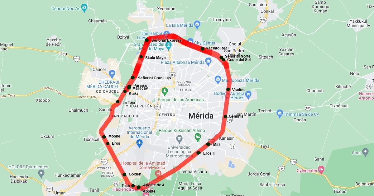 Mapa que señala los moteles ubicados principalmente en el periférico de Mérida en donde los trabajadores sexuales laboran en Mérida