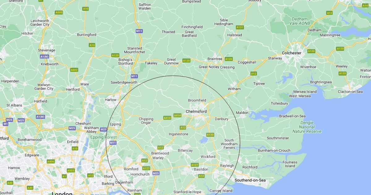 Radius of Mountnessing, Essex, UK