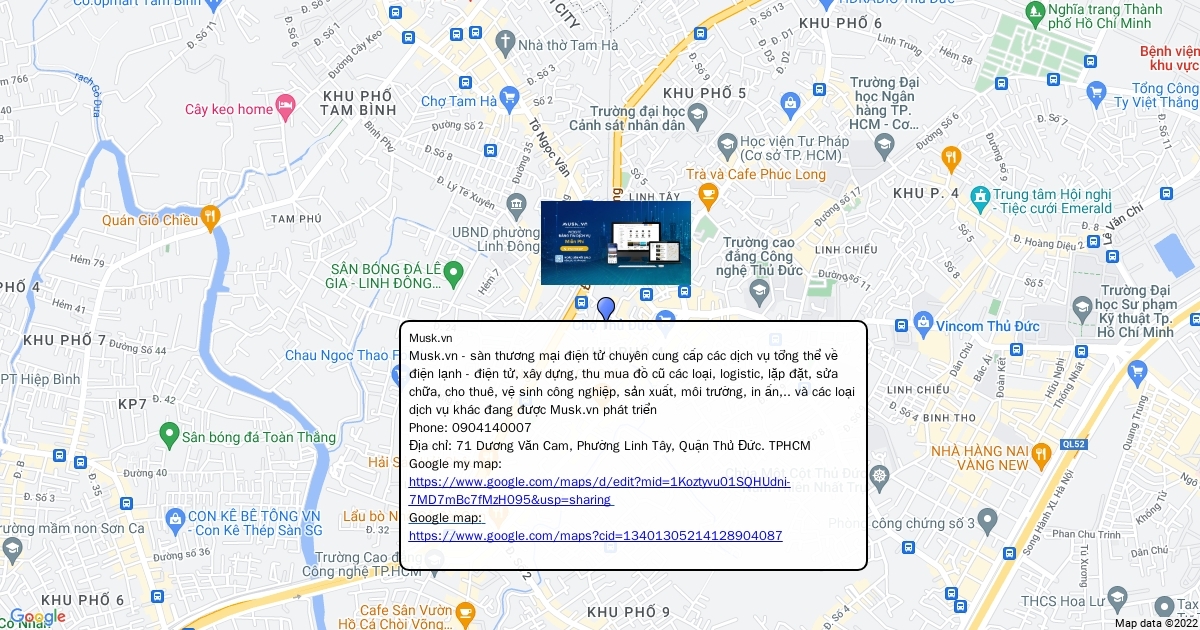Musk.vn - sàn thương mại điện tử chuyên cung cấp các dịch vụ tổng thể về điện lạnh - điện tử, xây dựng, thu mua đồ cũ các loại, logistic, lặp đặt, sửa chữa, cho thuê, vệ sinh công nghiệp, sản xuất, môi trường, in ấn,.. và các loại dịch vụ khác đang được Musk.vn phát triển Phone: 0904140007 Địa chỉ: 71 Dương Văn Cam, Phường Linh Tây, Quận Thủ Đức. TPHCM Google map: https://www.google.com/maps?cid=13401305214128904087 Google my map: https://www.google.com/maps/d/edit?mid=1Koztyvu01SQHUdni-7MD7mBc7fMzH095&usp=sharing