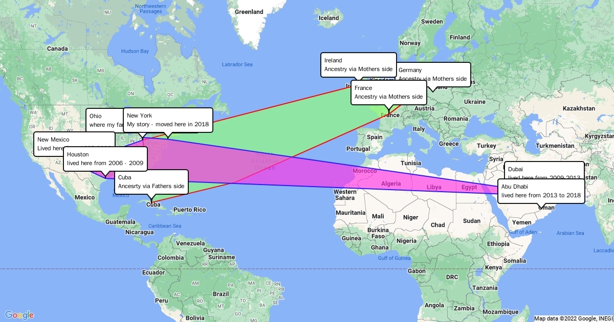 green is my ancestrys migration pink is my own migration