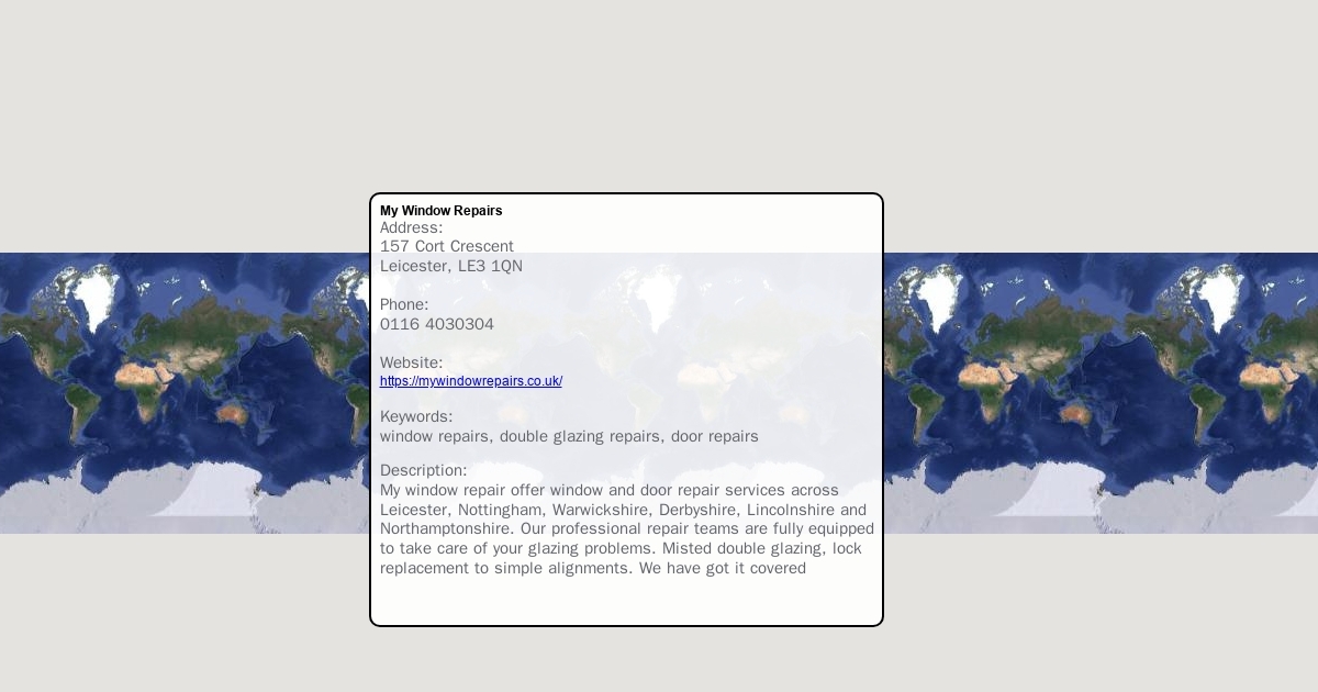 My window repair offer window and door repair services across Leicester, Nottingham, Warwickshire, Derbyshire, Lincolnshire and Northamptonshire. Our professional repair teams are fully equipped to take care of your glazing problems. Misted double glazing, lock replacement to simple alignments. We have got it covered