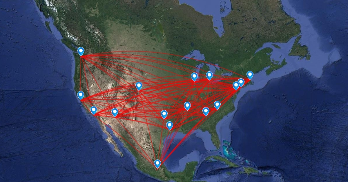 Norma Richards's flight route map in North America. Airport cities include: Memphis (hub), New York, Boston, Chicago, Philadelphia, Detroit, Atlanta, Charlotte, Dallas, Houston, Los Angeles, Denver, San Francisco, Seattle, Phoenix, and Mexico City.