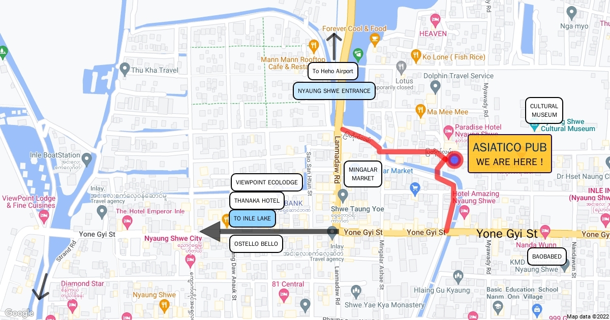 Map of Nyaung Shwe in Inle, Myanmar with the Location of Asiatico Pub