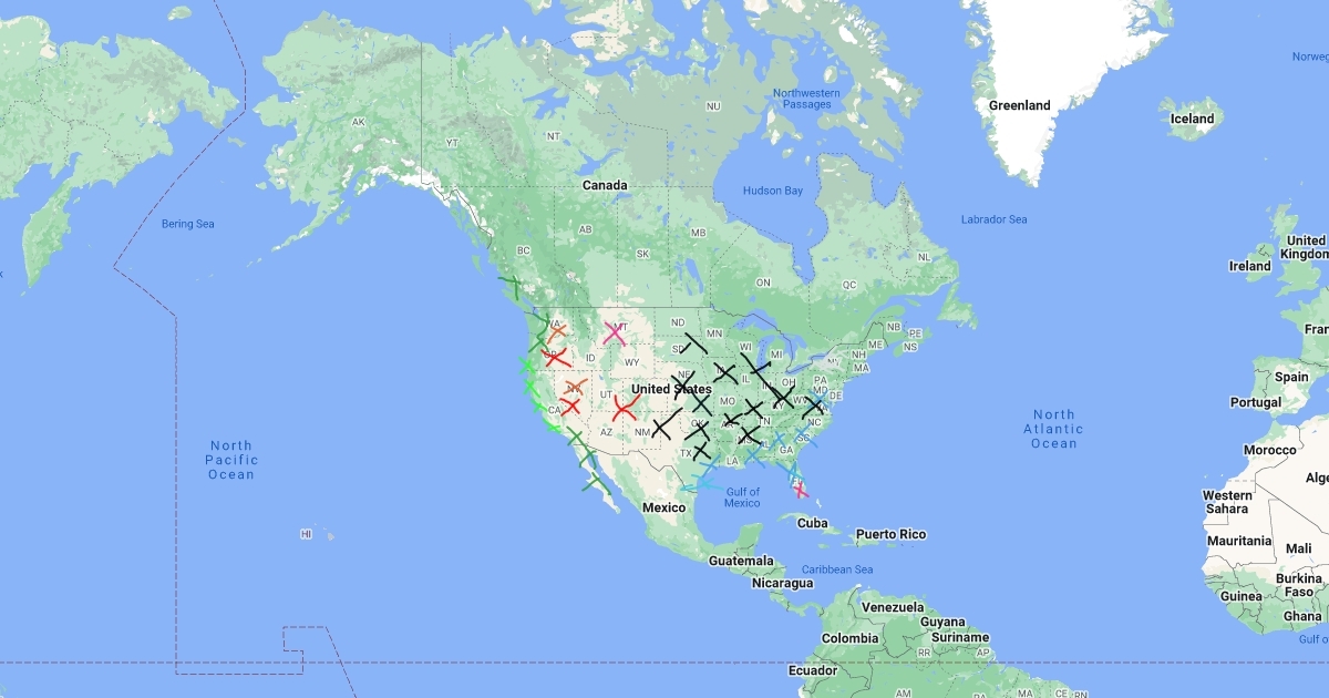 Tornados (schwarz), Hurrikans (blau), Wildfeuer (rot), Blizzards (weiß), Erdbeben (grün)